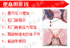 2、痔疮便血 一般发生于排便后,呈喷射状流出,或在便后滴血,出血呈鲜红色,血液与粪便不相混合,出血量不等,可伴有肛门异物感或疼痛。>>>痔疮引起的便血怎么治疗好?