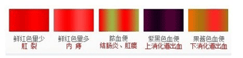 1、直肠癌:血色较新鲜或暗红色,粪便中可有黏液,往往血液、黏液、粪便三者相混。